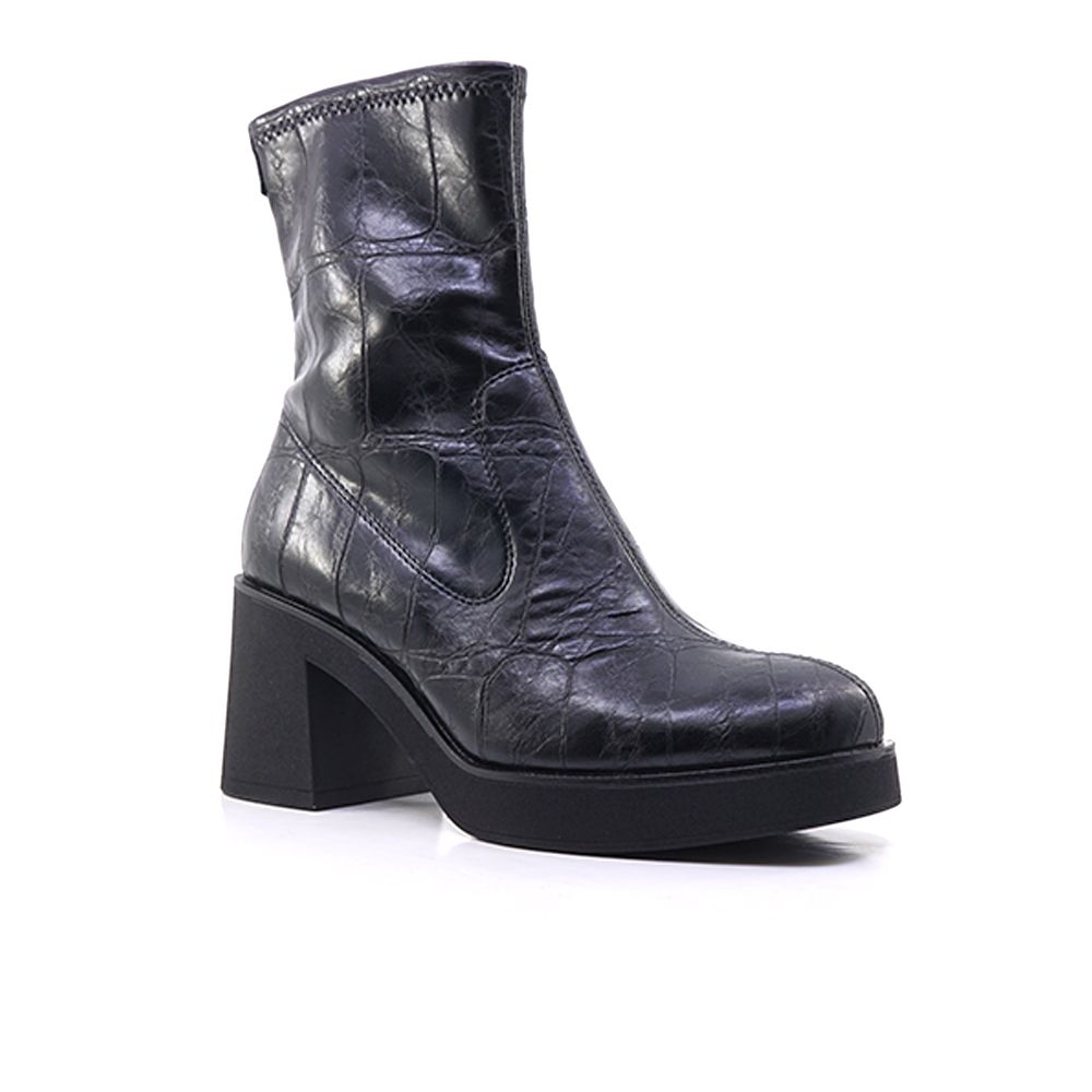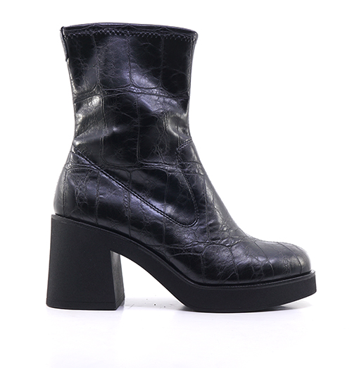 Γυναικεία μποτάκια Tamaris από συνθετικό δέρμα croco σε μαύρο χρώμα και λάστιχο σόλα, τακούνι 8cm. Κορδόνια για καλή εφαρμογή. Η αντιολισθητική σόλα και το σταθερό τακούνι υπόσχονται ασφάλεια και σταθερότητα σε κάθε σας βήμα.