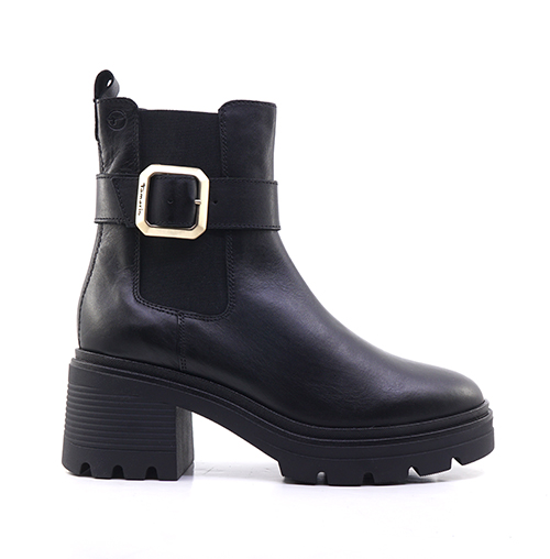Γυναικεία μποτάκια Tamaris από δέρμα σε μαύρο χρώμα, ελαστική σόλα και τακούνι 7cm. Η αντιολισθητική σόλα και το σταθερό τακούνι υπόσχονται ασφάλεια και σταθερότητα σε κάθε σας βήμα.