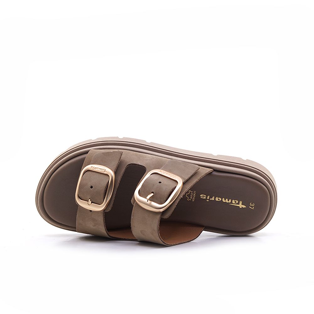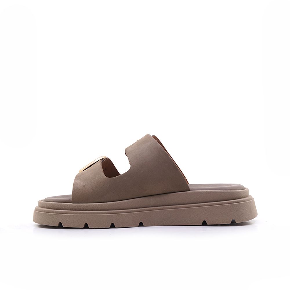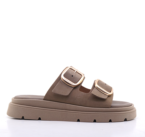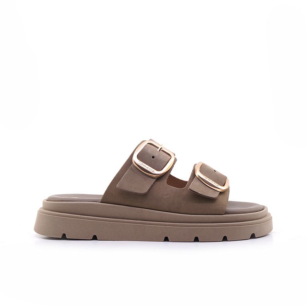Σαγιονάρα απο δέρμα σε πούρο χρώμα με φαρδιά λουριά στο κουντεπιέ. Διαθέτει σταθερό και μαλακό πέλμα για άνετο και ξεκούραστο πάτημα και εξωτερική αντιολισθητική σόλα. Ύψος τακουνιού: 3,5 cm.