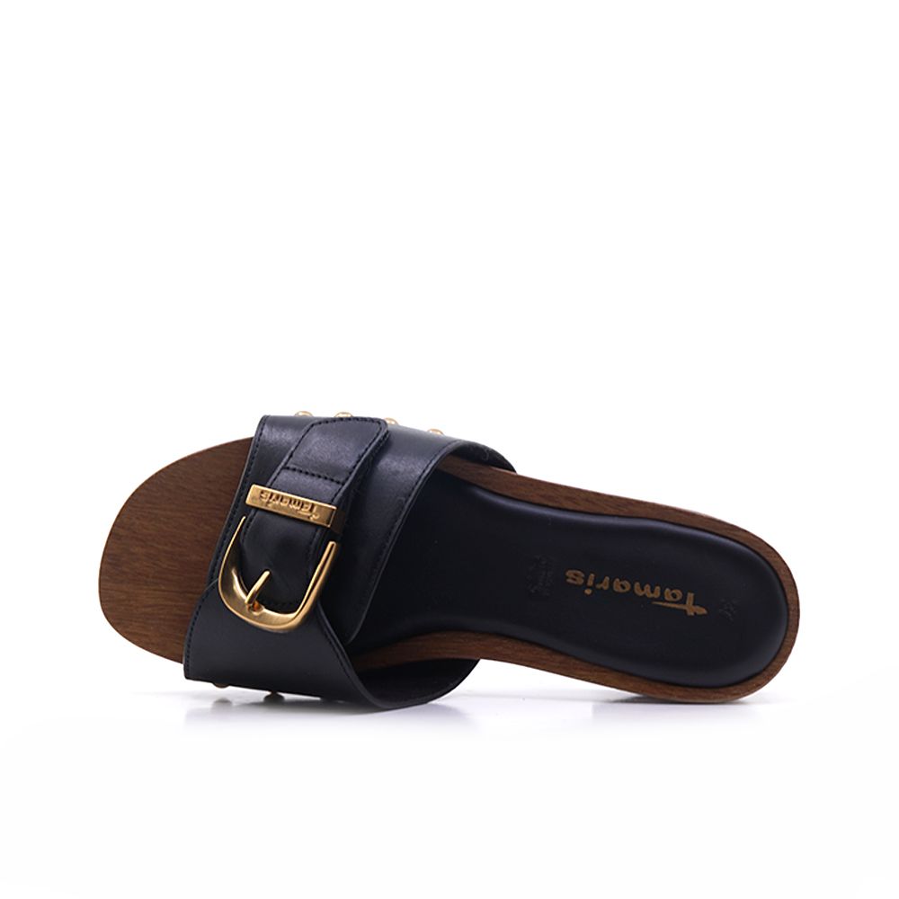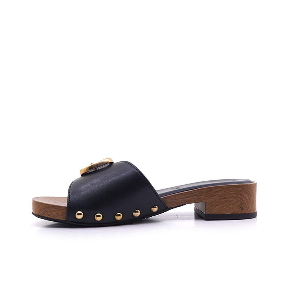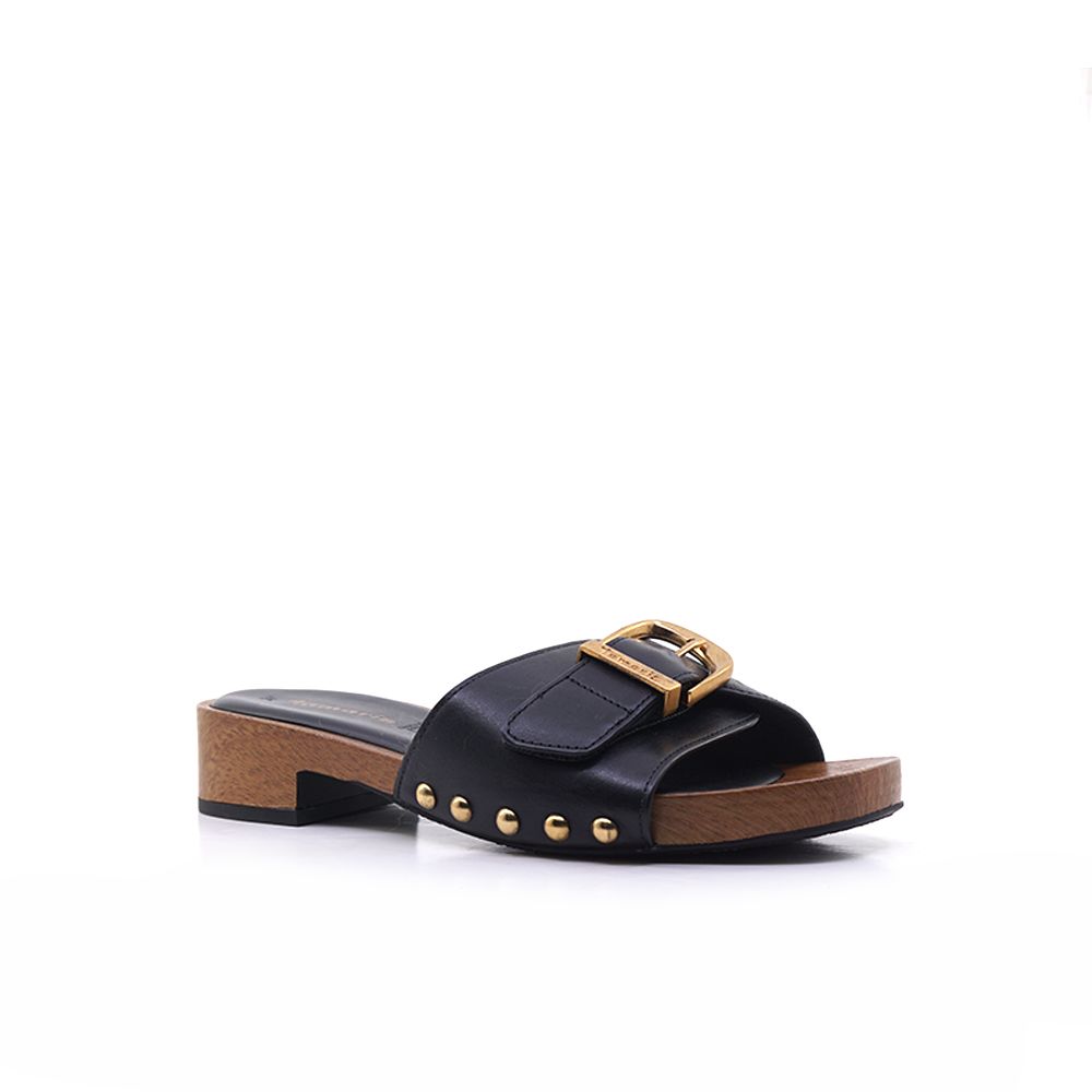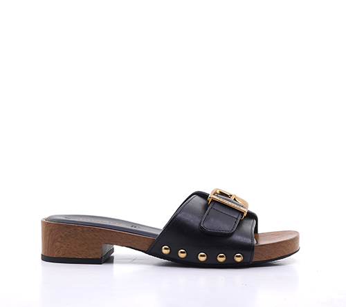 Σαγιονάρα απο δέρμα σε μαύρο χρώμα με φαρδύ λουρί στο κουντεπιέ. Διαθέτει σταθερό και μαλακό πέλμα για άνετο και ξεκούραστο πάτημα και εξωτερική αντιολισθητική σόλα. Ύψος τακουνιού: 3 cm.