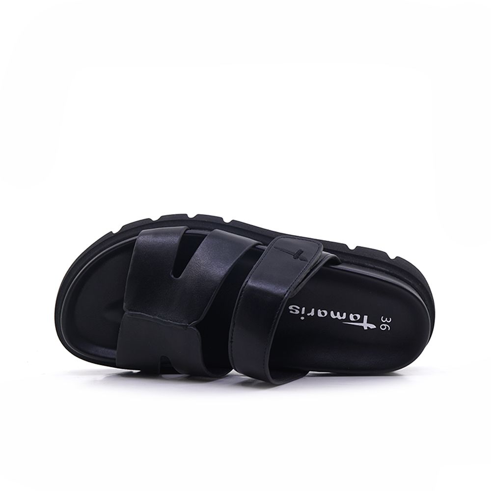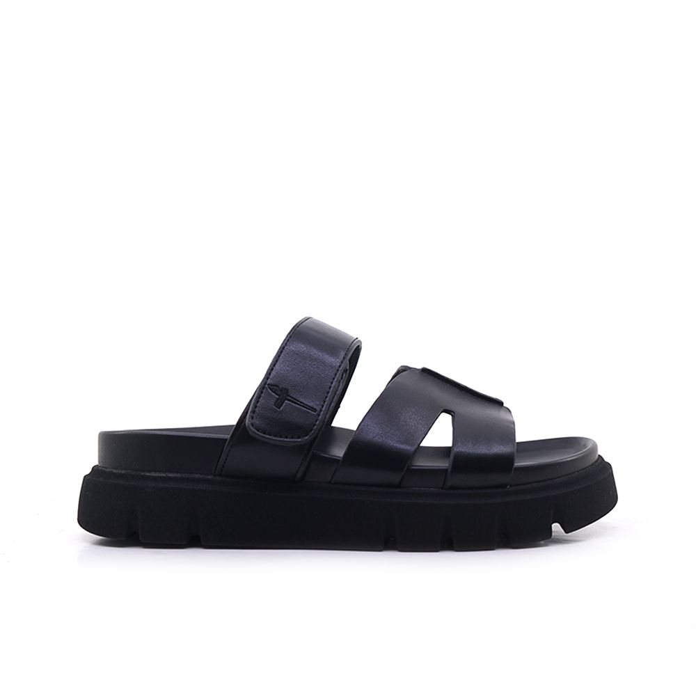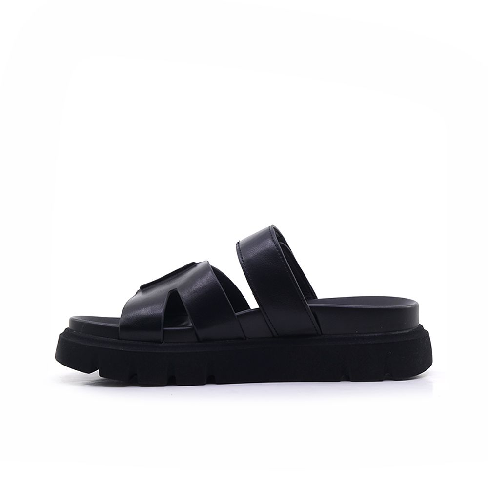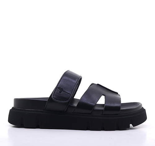 Σαγιονάρα απο συνθετικό δέρμα σε μαύρο χρώμα με φαρδιά λουριά στο κουντεπιέ. Διαθέτει σταθερό και μαλακό πέλμα για άνετο και ξεκούραστο πάτημα και εξωτερική αντιολισθητική σόλα. Ύψος τακουνιού: 4 cm.