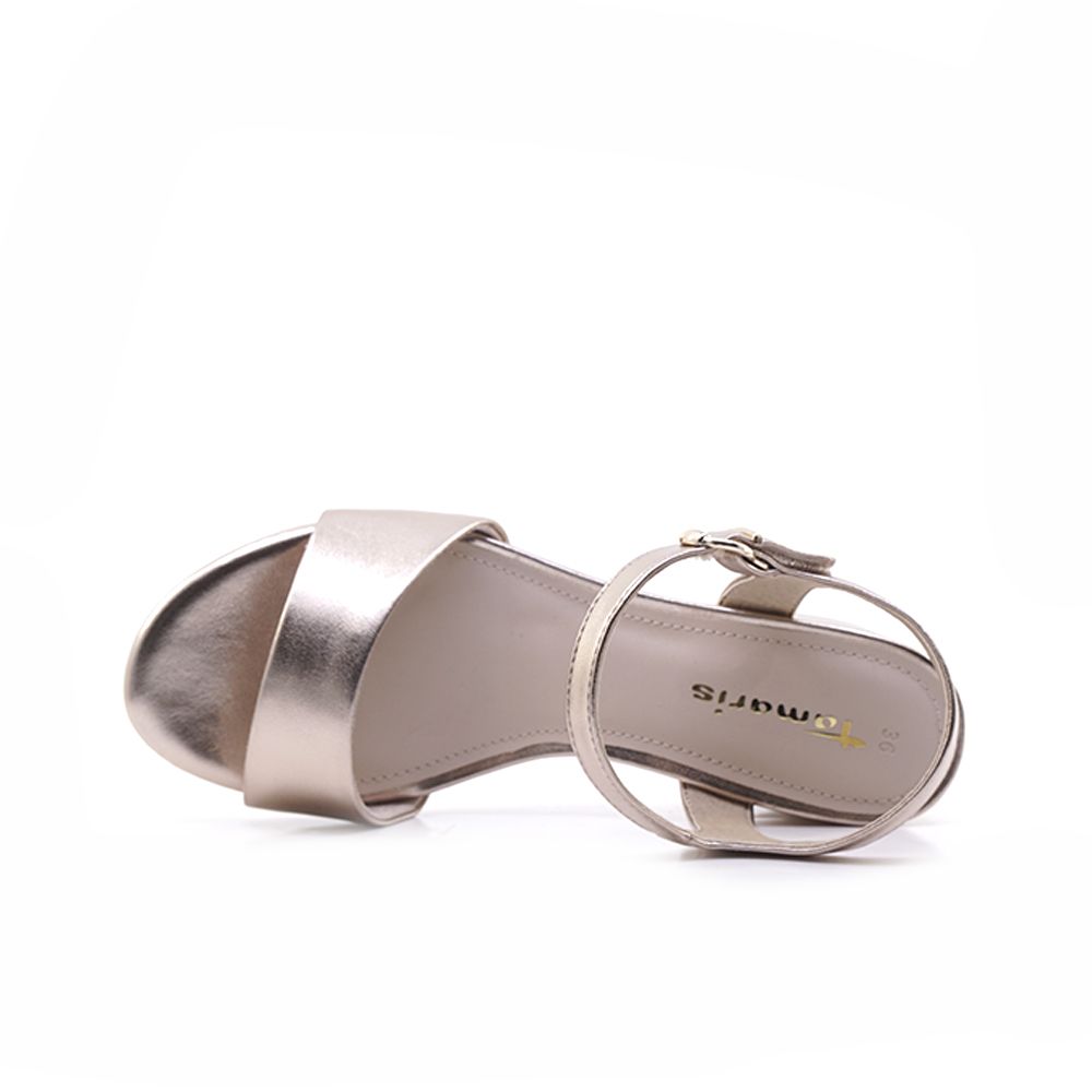 Γυναικεία πέδιλα Tamaris απο συνθετικό ΄δέρμα με τακούνι στα 5cm. Σε χρυσό χρώμα με λουράκια και ιδιαίτερη υφή, για λαμπερές εμφανίσεις που μαγνητίζουν τα βλέμματα σε κάθε σας βήμα.